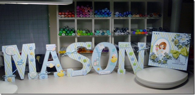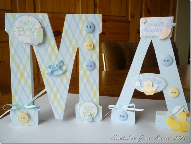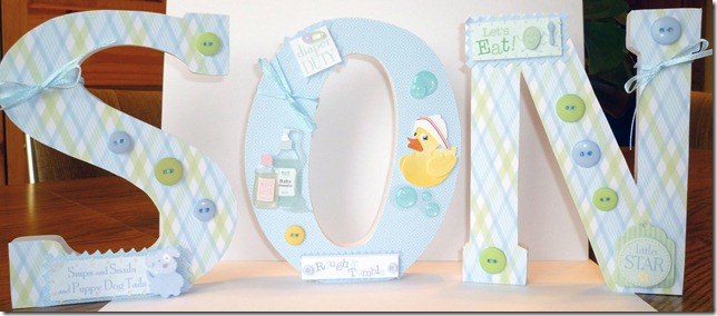 I’ve never tried decorating letters but it was pretty easy & lots of fun. I’m afraid I went overboard on the embellishments but I couldn’t stop adding little ducks & buttons & bows. I want to remind her to not hang it to close to his crib cuz there’s a lot of tiny pieces that I sure don’t want to fall into his bed.