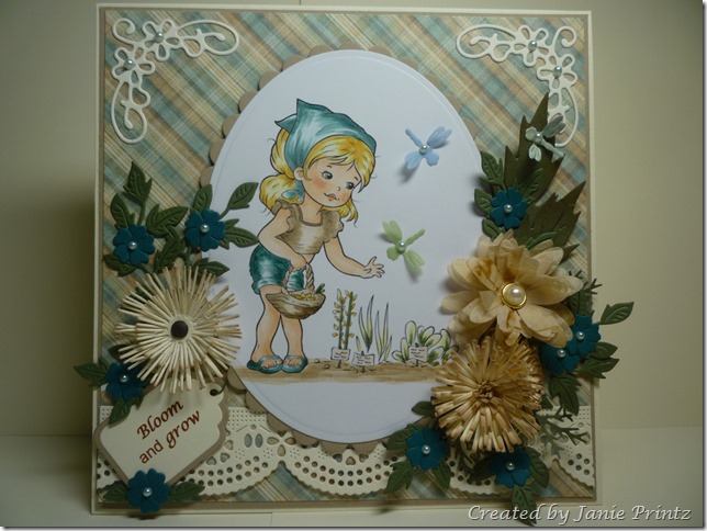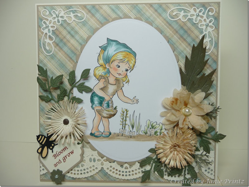 I’ve used one of the new digi images called “Freshly Harvested” & I think she’s just adorable. She reminds me of several of my grand daughters out picking a few veggies or a pretty bouquet of flowers they’ve grown. For my pretty background paper I printed out a sheet from their digi pack called “Distinguished” & chose my Copic colors from it to color up this sweet little girl.