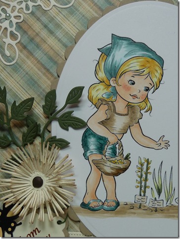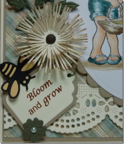 Here’s a close up of the adorable little gardener out harvesting & one of the Spikey flowers I made with another Cheery Lynn die from the “Build a Flower” #1 set. I LOVE these flowers, you just run the die thru a couple of times & you have enough to make several flowers using the different layers it cuts out. It also cuts a lot of different leaves but the one I used with this flower is another new Cheery Lynn die, a Flourish Leaf Strip that cuts & embosses 5 or 6 leaf branches out at a time. I also used a couple of Tiny tags nested together & a cute little bee but then decided the bee looked out of proportion with everything else on my card so pulled it off & then to my dismay it pulled a big chuck of my pretty designer paper that I had printed off.