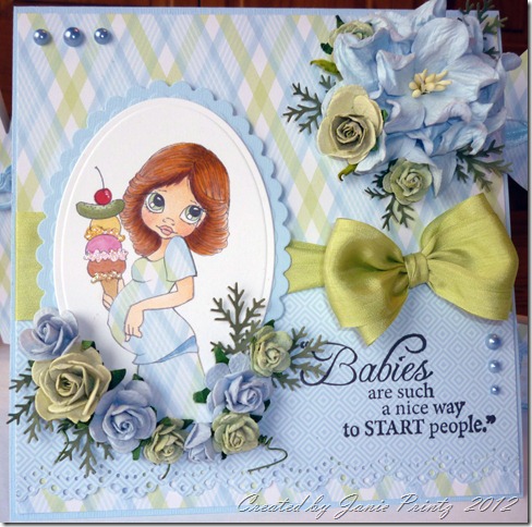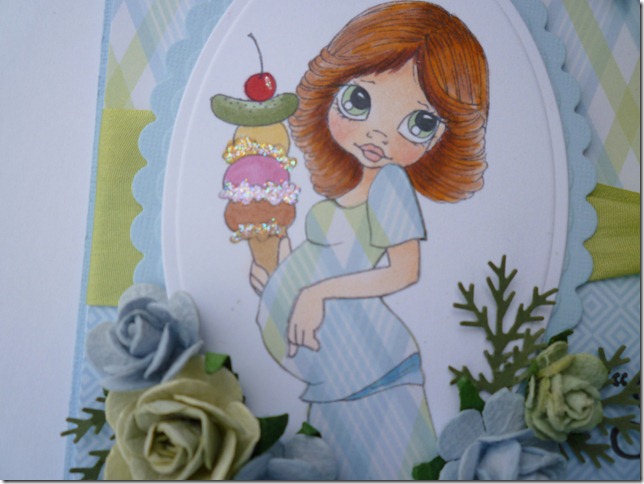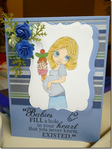 I used a digi image from Saturated Canary called “Ice Cream & Pickles” & couldn’t have found a more perfect stamp for a young ladies 1st baby. I colored her with Copics & then decided to paper piece her clothes to match the papers in the card … That beautiful ribbon was a gift from my sweet friend Sharon Caudle & I made the bow using a Bow maker that I made myself out of a pine board & a few shop tools. I saw one on Becca Feekins blog months ago but wanted to try making my own. It works great & really is like having another pair of hands.